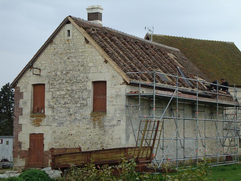 Le faîtage est terminé. On aperçoit au fond à droite du faîtage les 2 aérations du système d'épandage (le plus à droite) et de la hotte aspirante de la cuisine