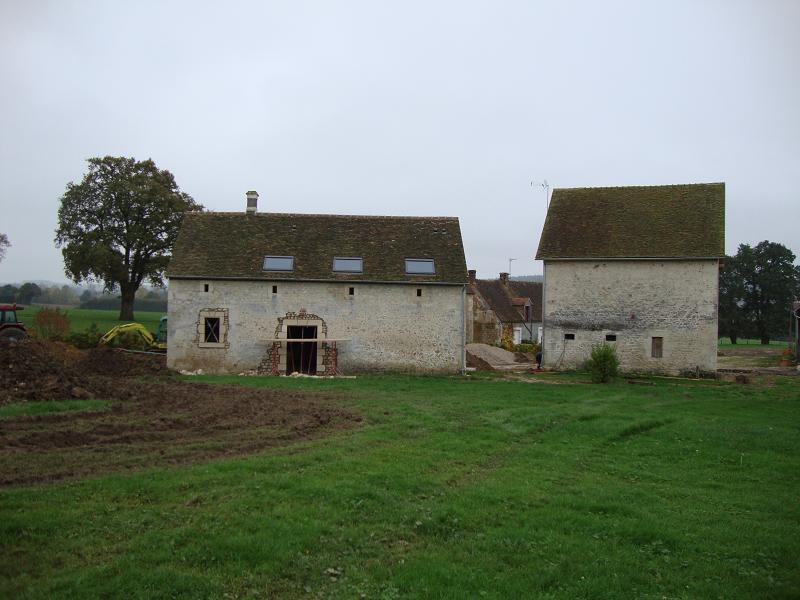 ... sur l'échafaudage les 2 pierres et la clef de voûte qui viendront composer le linteau de la porte fenêtre. Un linteau béton sera ensuite coulé derrière les pierres pour soutenir la grosse poutre de la cuisine.