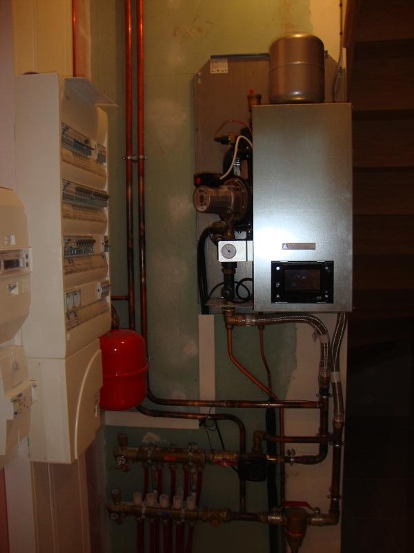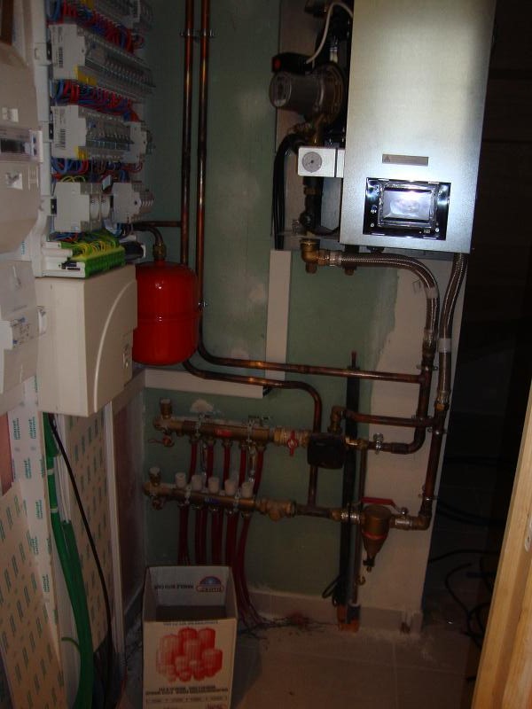 La chaudière (toujours le ventre à l'air) avec sa pompe à chaleur extérieure a fonctionné tout le week-end La température était très agréable dans la maison. Mais je suis obligé de l'arrêter pour poursuivre la pose du carrelage. On remarque les 5 robinets blancs pour ouvrir et fermer le chauffage 2 de gauche pour le séjour, 2 du centre pour la cuisine 1 de droite pour la salle d'eau, local technique, WC et hall devant escalier