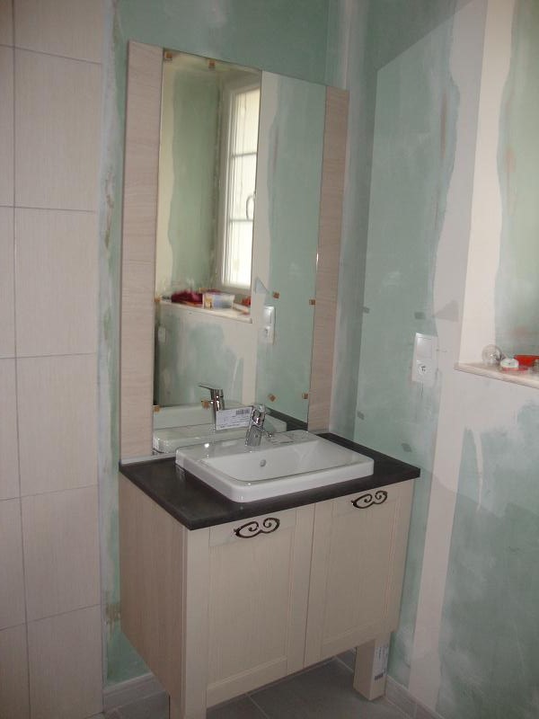 22 octobre 2013 Pose du meuble lavabo Les éclairages , 2 spots, sont absents Il faut être très très patient, courage !!!