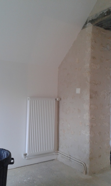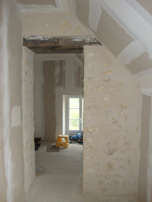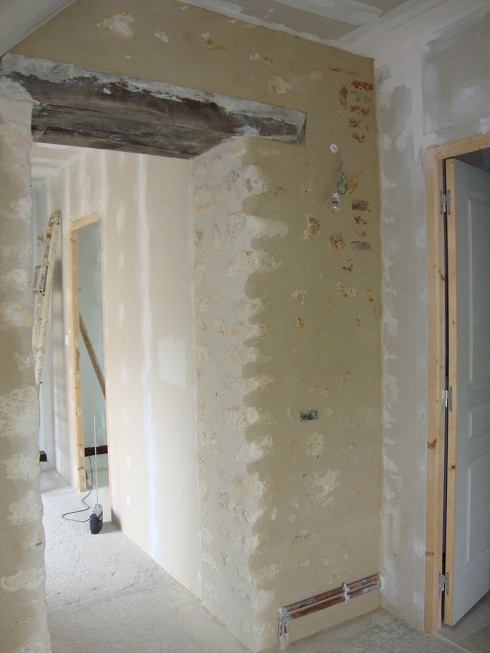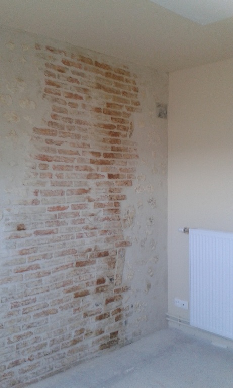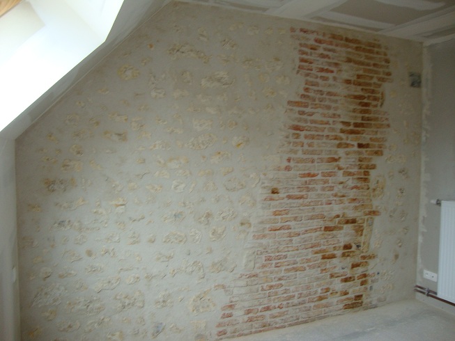 Enduit gratté dans une chambre. On aperçoit les briques du conduit de cheminée qui resteront apparentes