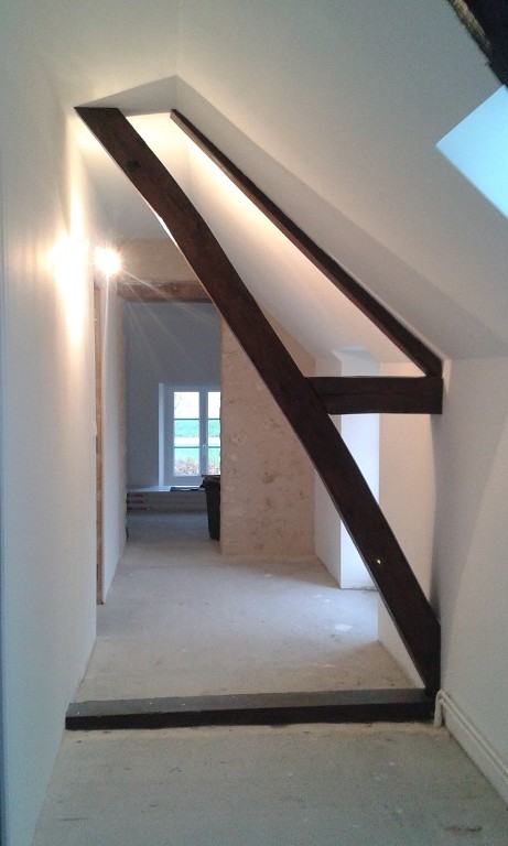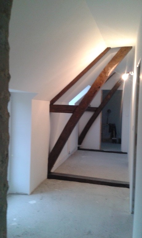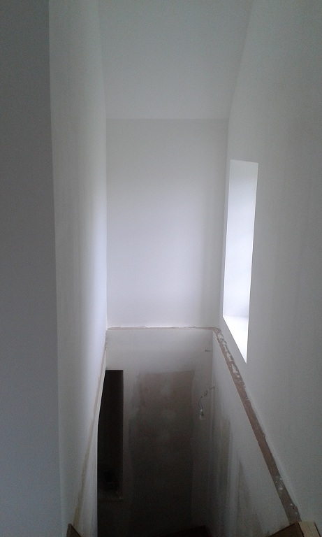 Fin de l'enduit gratté sur le palier, reste à nettoyer la poutre !