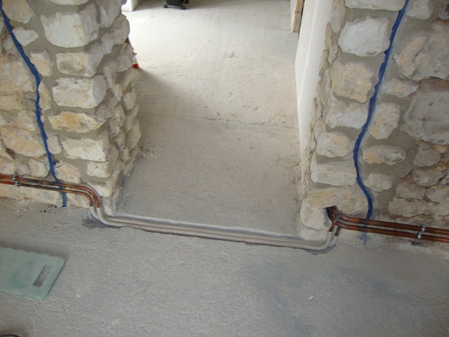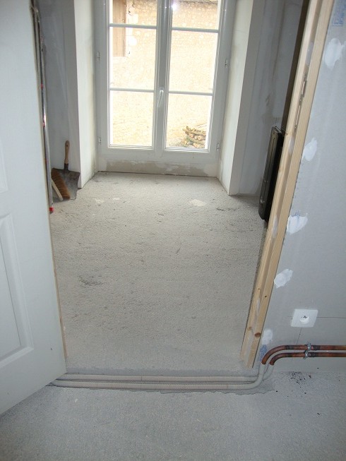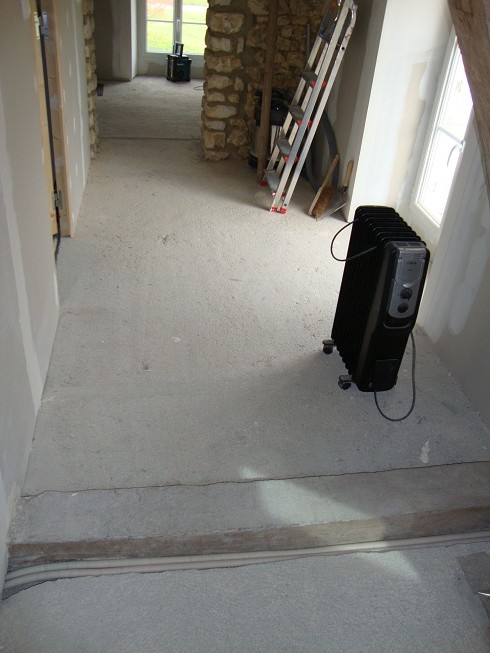 Repérage des tuyaux de chauffage central encastrés dans le sol avant la pose du parquet flottant ... sur le palier vers le couloir...