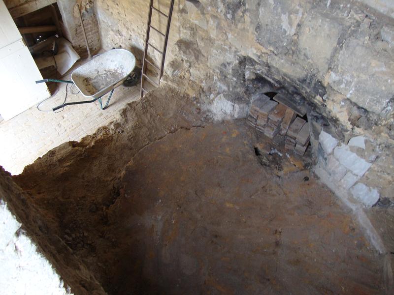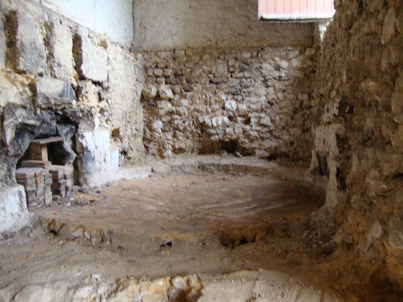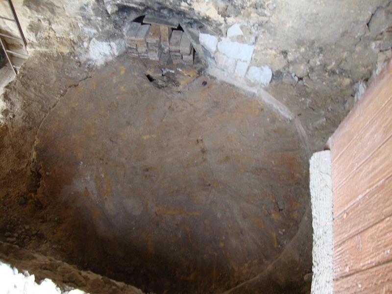 Matinée du 4 avril : rabotage des grosses pierres enchâssées dans le mur et retrait des dalles en terres cuites de l'âtre. Il semblerait que sous l'âtre ce soit assez creux, on aperçoit des "jours" sur le devant, surprenant, non ? Suspense pour la suite des travaux !!!