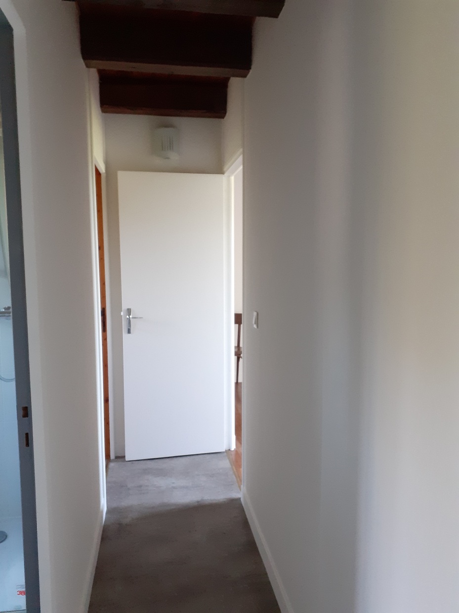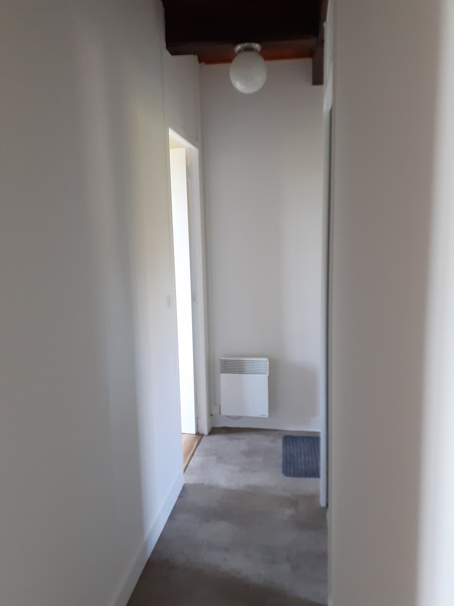Le couloir, photo prise de la grande chambre, au fond à droite, la petite chambre, au fond à gauche l'escalier, au milieu à gauche, la salle d'eau