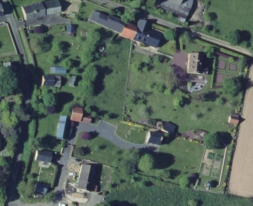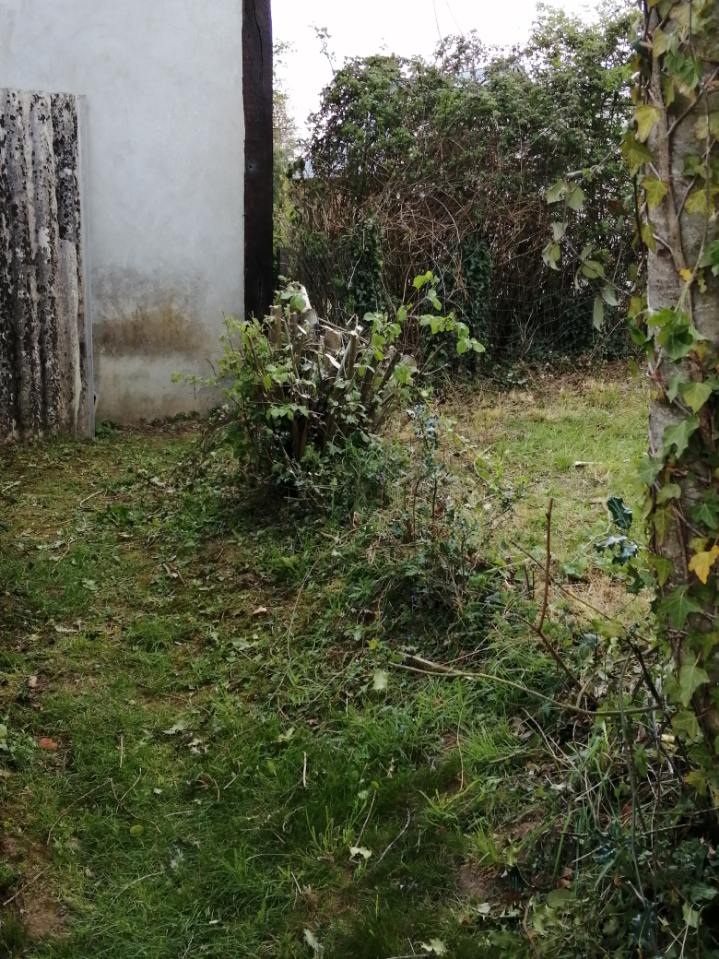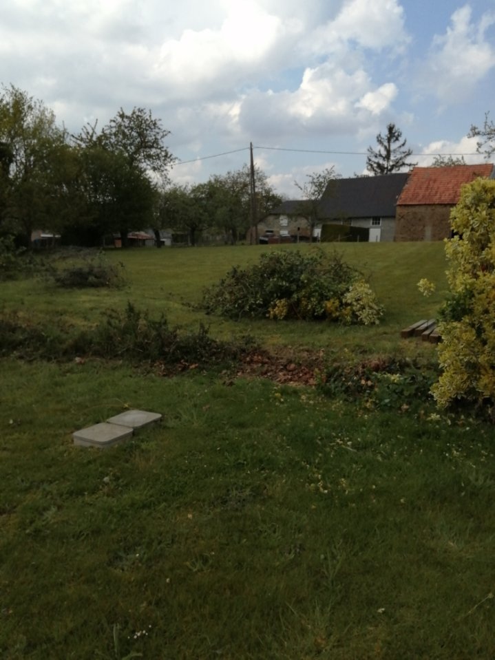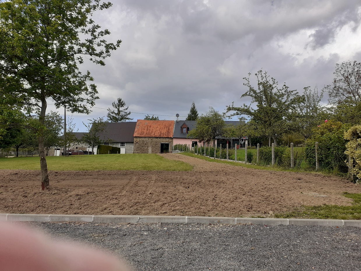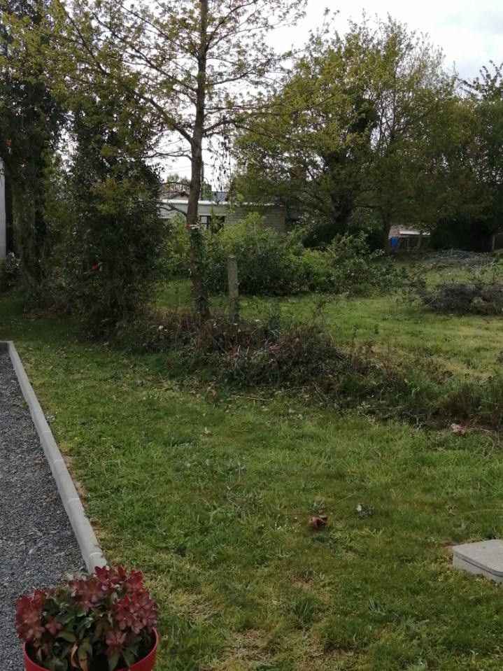 Acquisition d'un nouveau terrain compris entre les 2 dépendances à tuiles rouges Début des travaux d'arrachage de la haie existante