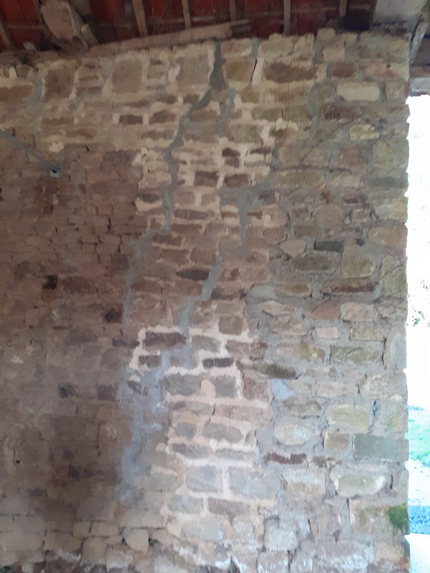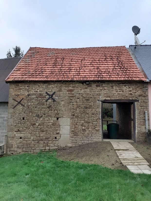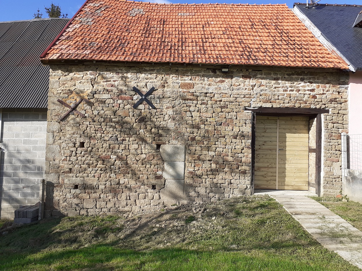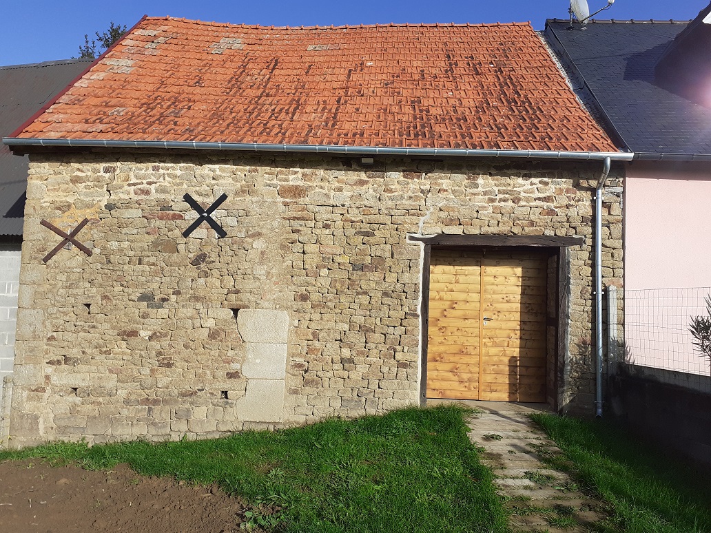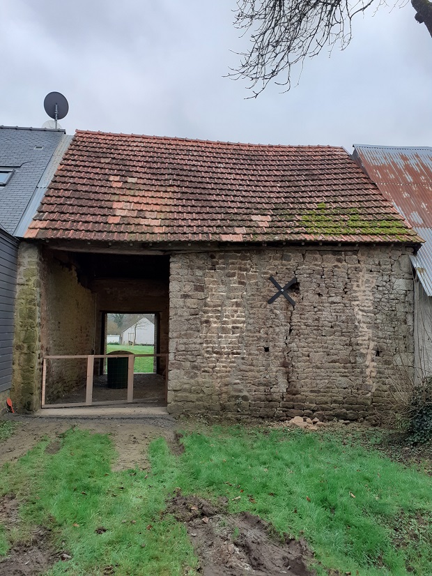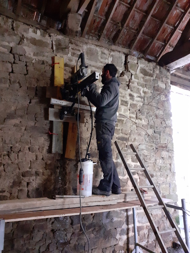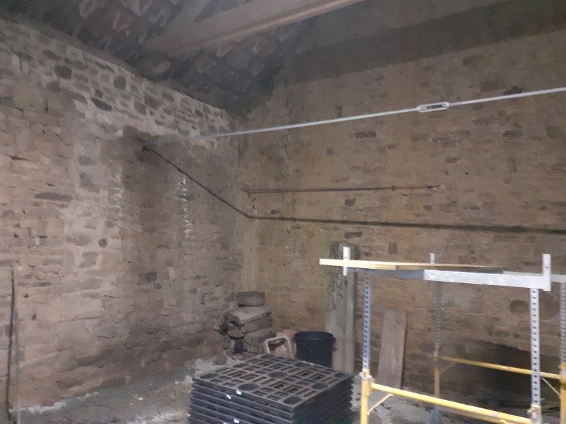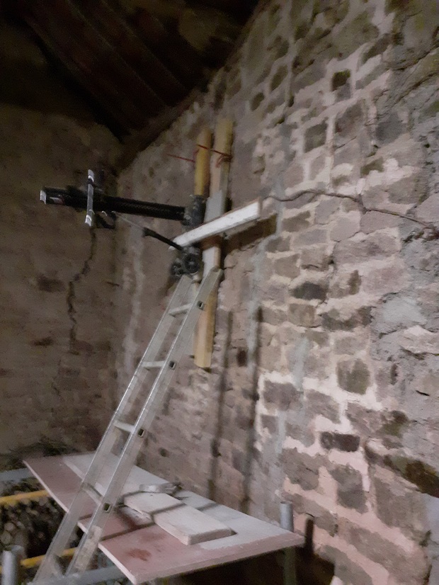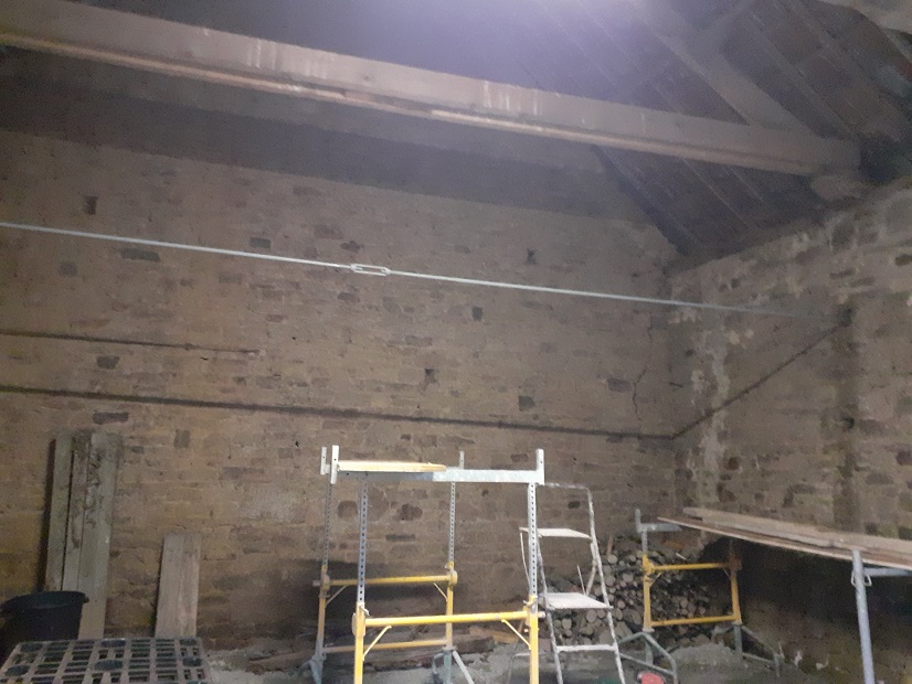 Installation d'un tirant pour consolider cette vieille grange